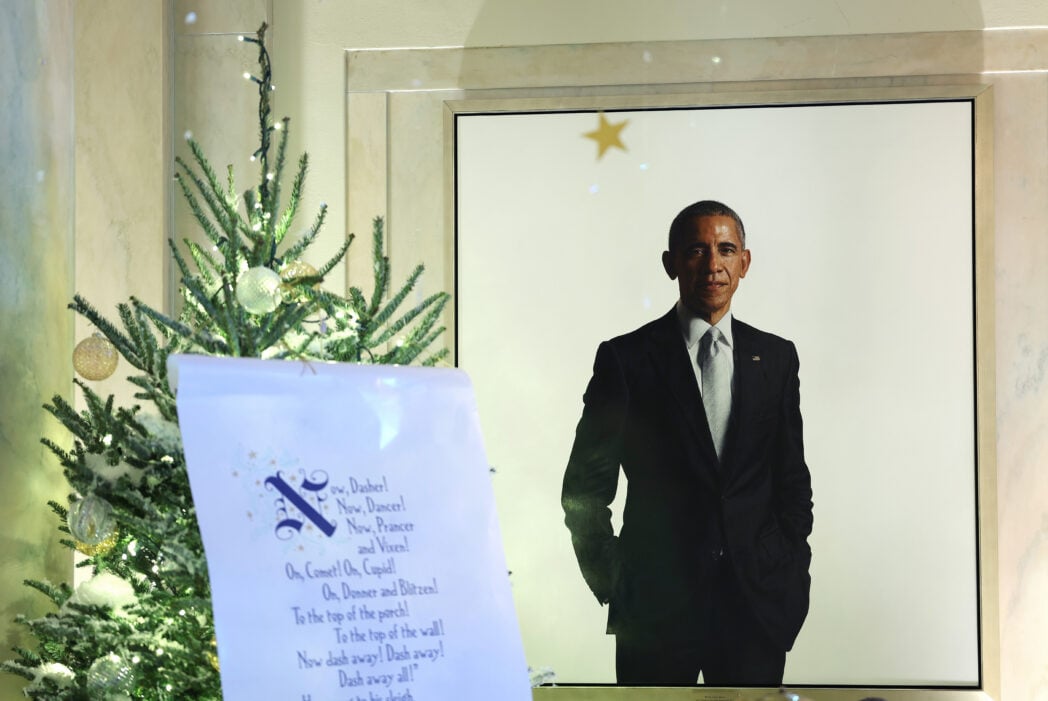 WASHINGTON, DC – NOVEMBER 27: The official portrait of President Barack Obama is seen alongside Christmas decorations in the Entrance Hall during a media preview of the 2023 holiday decorations at the White House November 27, 2023 in Washington, DC. The theme for this year’s White House decorations is “Magic, Wonder and Joy,” and is designed to capture the “delight and imagination of childhood.” The White House expects to welcome approximately 100,000 visitors during the holiday season. (Photo by Kevin Dietsch/Getty Images)