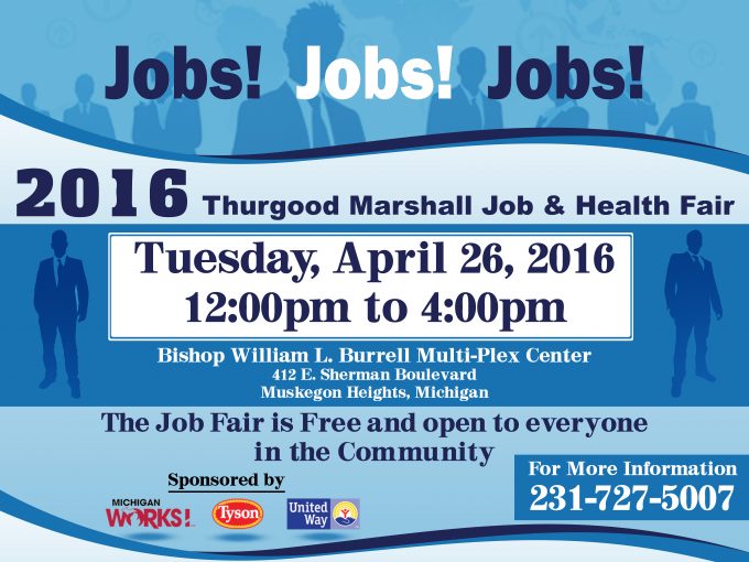 Muskegon, MI (April 20, 2016) –West Michigan Community Help Network is proud to announce the annual Thurgood Marshall Job & Resource Fair coming to the Bishop Williams L. Burrell Multi-Plex Center on April 26, 2016 from 12:00pm- 4:00pm. The Thurgood Marshall Job Fair is a public service made possible by a unique partnership of organizations with an interest in promoting economic development in the Muskegon area. This is a free event opened to the public. A free health checkup will also be provided by Healthcare Inc.